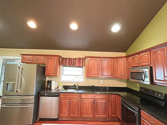 Welcome to this inviting home offering both charm and convenience. Step inside to find a warm and welcoming layout featuring hardwood floors, elegant light fixtures, and a spacious kitchen with rich wood cabinetry, stainless steel appliances, and granite counters. The open dining area with vaulted ceiling and chandelier creates the perfect space for family gatherings or entertaining. Bedrooms are bright and comfortable, each offering plenty of natural light and storage.