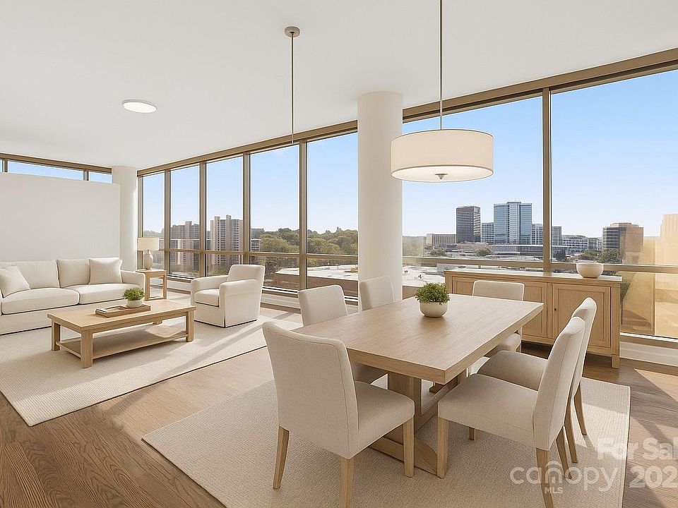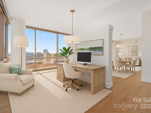 Enjoy the ease of city living, walkability, and the concierge lifestyle in this beautiful, light filled condo in the heart of the South End. Stunning views in this updated condo that's been thoughtfully re-designed to make the most of the city views and flexible floorplan with a separate office space, living & dining, plus two bedrooms! Relax or entertain in the open and airy living and dining rooms surrounded by walls of windows. Or, retreat to the separate office space with access to one of the two balconies. Kitchen has white cabinets, stone counters, & newer ss appliances including a gas range. The spacious primary bedroom features a private balcony, large walk-in closet designed for maximum functionality, and renovated bath w/ white double vanity, quartz counters & a large walk in shower. 2024 HVAC and water heater for ease of mind and living. This unit comes with two parkings spaces -a huge benefit in the bustling south end. Located just 2 blocks from the 2 light rail stations offering true walkability to work and play. The Arlington features on-site concierge, rooftop pool & patio with incredible city views, fitness center, and the ease of a living only a few locations in Charlotte offer.