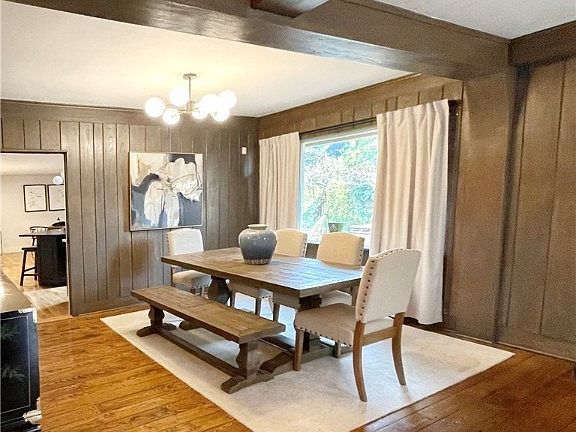 Step inside to a spacious, move-in-ready floor plan featuring original hardwood floors and elegant Brazilwood paneling in the living and dining rooms. The inviting living room, with its Regency wood-burning fireplace, flows into the sunroom through sliding glass doors, offering a perfect blend of indoor and outdoor living. The newly remodeled kitchen boasts high-end appliances and modern finishes while preserving the home’s timeless character.