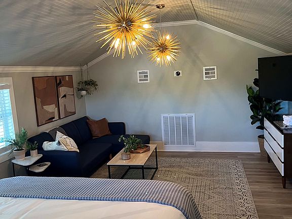 Utilities included! Embrace style and comfort during your stay in our 2-story townhouse. This charming 1-bedroom, 1-bathroom retreat features a well-equipped kitchen with a microwave, a cozy living room, and a bistro dining area, all thoughtfully designed for your comfort. The bedroom suite boasts a king-size mattress with upgraded bedding, and there are two comfortable sofas one upstairs and one downstairs along with Smart TVs for your streaming pleasure and free Wi-Fi throughout the property.