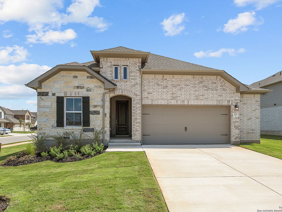 This stone and brick one story home on a large corner lot has great curb appeal. It has 3 bedrooms, 2.5 baths, 2-car garage with a 5' extension for storage. The 8' front door leads you into the wide foyer with eleven-foot tray ceilings and hardwood floors throughout the common areas greet your guests. The gourmet kitchen is well equipped with 42" cabinets, quartz countertops, built-in SS Whirlpool appliances with a 5 burner gas cook top. The large kitchen island and open-concept living area makes it easy to entertain inside or outside on the Texas sized covered patio. The primary suite with bay window offers a spacious bedroom, large shower, garden tub and double vanities. Everyone loves a mudroom, which makes staying organized so easy. Don't miss out on this home that is a perfect balance of size and functionality!