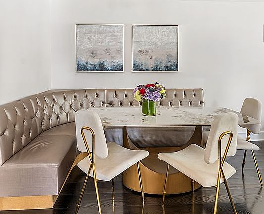 A gracious entry foyer leads into an expansive great room, surrounded by tree-top views that create a sense of calm and retreat from city life. The space flows beautifully into the open chef's kitchen, outfitted with top-of-the-line appliances, a center island with breakfast bar, and sink disposal. It also offers a custom built-in banquet perfect for casual dining, but can also accommodate seating up to eight.