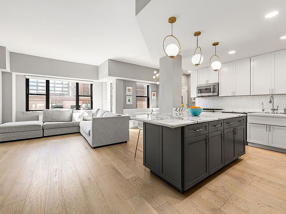 Gut-renovated in 2021, with wide oak floors and almost 10ft ceilings throughout, this two-bedroom, sky-high home is beautifully finished and completely move-in ready.