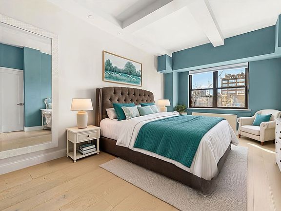 The primary bedroom feels like a true retreat from the city — large enough for a king bed and home office setup, with a sunny south-facing view, beamed ceilings with soffit lighting, and an oversized walk-in closet. The en suite bath sits behind a barn door and is done entirely in pristine marble. It includes plenty of storage and a gorgeous decoratively tiled shower that feels like a spa (and is big enough to fit four people).