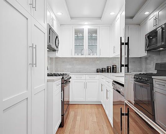 The sleek, renovated kitchen is outfitted with top-of-the-line appliances, ambient lighting, and generous cabinetry — perfect for any home chef. Additional features include beautiful hardwood floors and through-wall air conditioning units in both the living room and bedroom.