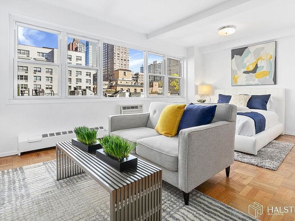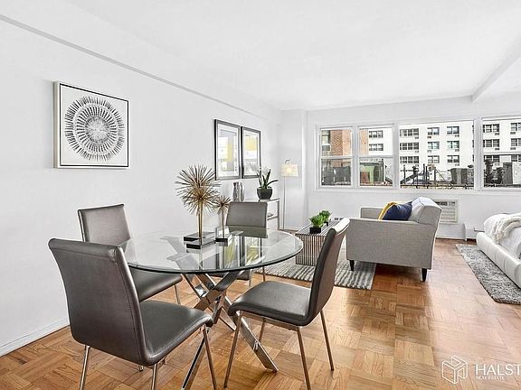 BRIGHT AND SPACIOUS ALCOVE STUDIO Sure all apartment write-ups will tell you the listing has it all. In this case, it's true. For more detail, read on. This alcove studio is spacious, offering an entryway, a dining area, a living area and a place to fit a Queen-sized bed. Sun shines in through the wall of five windows, which clear the buildings across the way, offering an enormous amount of blue sky to cheer up your day. The pin-drop quiet home also has three closets, a through-the-wall air conditioner and a separate kitchen that can be opened to the living/dining areas. The full-service, doorman building with a roof deck, is in a vibrant section of the Upper East Side, and a half a block from the entrance to the Second Avenue Subway. Pied-a-terres are permitted, as are your pets. To recap. If you're looking for a place that feels like home, you've found it.