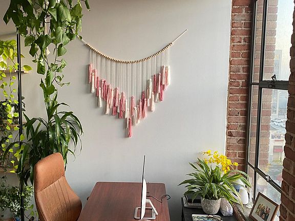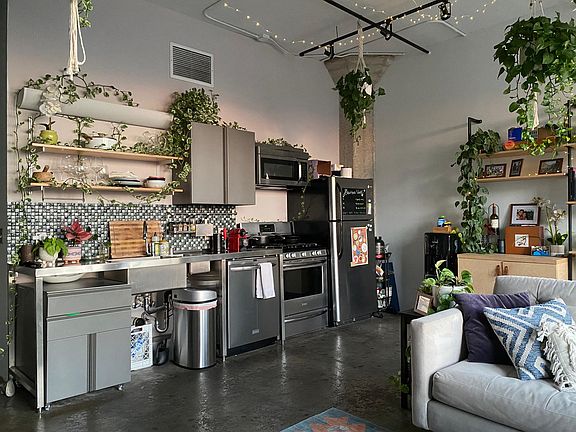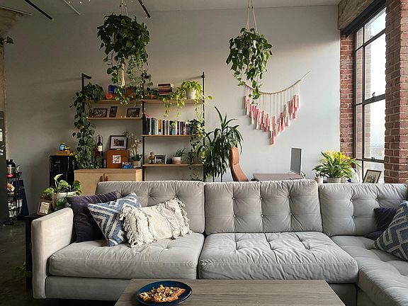 FULLY FURNISHED APARTMENT including refrigerator, dishwasher, queen-sized bed, full sectional couch, new mounted OLED TV, shelving, house plants and hanging plants, office standing desk.
