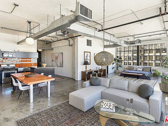 Large authentic corner loft w/walls of industrial steel framed glass overlooking the downtown/mountain skyline in the landmark Textile Center, a Mills Act building that qualifies for substantial property tax savings. The open floor plan with high ceilings and exposed concrete columns has open kitchen with center island, breakfast bar and built-in dining table. The loft is set up with one defined bedroom, one open bedroom, two luxurious bathrooms, one with laundry and lrg wlk-in closet. Includes secure parking space and storage unit. Building has roof top deck. As a part of Santee Village Lofts, amenities include outstanding 24 hr gym, rooftop pool/spa, driving range, basketball court, barbecue area. In the heart of the fashion district, the building is blocks from upscale shopping, restaurants, metro & much more. Built in 1926, this coveted Italian Renaissance Revival building is distinguished as a Los Angeles Historic Cultural Monument and National Register of Historic Place
