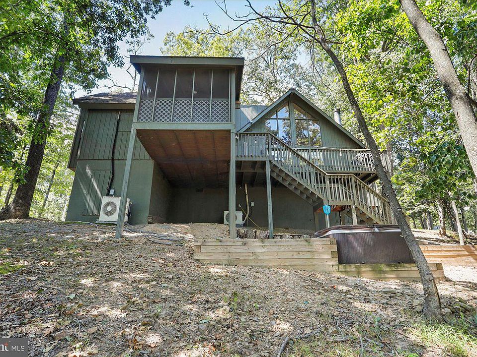 Escape to this stunning A-frame cabin nestled in the serene woods of Hedgesville, West Virginia. This architectural marvel features soaring ceilings, floor-to-ceiling windows, and an open living concept that creates a breathtaking tree-house experience. Located on 2+ acres of pristine wooded land, the property offers ultimate privacy just under two hours from the DC/Baltimore metro area. The home boasts two spacious bedrooms on the main level plus a versatile loft offering additional sleeping accommodations or bonus room potential. The primary bedroom suite features a spa-like bathroom with new fixtures, a ceiling fan, and ceiling-height windows for stargazing. The second bedroom on the main level conveniently connects to its own bathroom. The loft provides flexible space with a newly installed mini-split unit (2024) for optimal comfort, plus its own bathroom. All three bathrooms showcase luxury LVP flooring, custom cabinets, modern countertops, new tubs, shower pans, designer tile work, and premium plumbing fixtures and toilets (2022). The open-concept living area centers around a wood-burning fireplace and features cozy wood paneling, new electrical fixtures, and a ceiling fan (2022). The family room includes an energy-efficient mini-split system (2022) for year-round comfort. The fully equipped kitchen showcases new appliances including a dishwasher and microwave (2024), plus a convenient built-in dog bowl station for pet-friendly living. The screened-in porch provides the perfect dining space with forest views, while the brand-new laundry room (2022) adds modern convenience. Outdoor living is exceptional with a private hot tub (2022), fire pit area, and a screened-in front porch. The backyard features a new retaining wall that extends the usable space (2022). Modern conveniences include an EV charging station in the driveway (2022) and Yale smart lock system (2024) for keyless entry. The property features a new water heater, ERV fresh air system, and complete electrical upgrade with new outlets and plugs (2022). The home was fully repainted inside and out in 2022. The property offers dual-purpose potential as both a luxury personal retreat and proven investment opportunity. With an outstanding 4.94-star rating as a successful vacation rental, it demonstrates strong income potential. The location provides easy access to Berkeley Springs State Park, Cacapon State Park, and over 22,000 acres of public recreation land. Owner is a licensed real estate agent in Virginia.