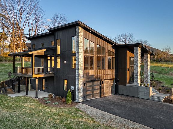 OPEN HOUSE - Thursday, November 6th, 5:00 - 6:30 PM. Nestled in the prestigious Winfield Heights development and surrounded by picturesque mountain views, 315 Farmhill Drive is a striking contemporary 5-bedroom, 3.5-bath residence that beautifully blends modern design with everyday functionality. The home impresses from the start with vaulted 18-foot ceilings and walls of windows in the living and dining areas, where a natural gas fireplace framed in stunning floor-to-ceiling stonework creates a warm and dramatic focal point. French white oak floors flow throughout the home, showcasing exceptional craftsmanship and timeless style, while underlit, motion-sensing stairs add a touch of modern sophistication. The gourmet kitchen features quarter-sawn white oak cabinetry, a quartz waterfall island with matching backsplash and custom shelf, a 36-inch professional range with pot filler, a quiet remote blower range hood, and a custom walk-in pantry. The luxurious primary suite offers a spa-inspired bath with hydronic in-floor heating, a freestanding soaking tub, and a high-end tile shower, along with a spacious walk-in closet. Three additional bedrooms—one of which could serve as a home office—and a full bath with custom tile work enhance the home’s versatility and design flow, while a stylish half bath and laundry room with custom cabinetry, utility sink, and quartz countertops complete the main level. The finished lower level offers an additional bedroom, full bath, and an exercise room with egress that could also serve as a bedroom, along with a family room featuring a wet bar—perfect for guests or an in-law suite. The oversized two-car garage with extra storage and built-in entryway lockers adds everyday practicality. The exterior combines cement fiber and stone finishes with sleek black casement windows, while the covered composite deck and large concrete patio create the perfect outdoor retreat for relaxing or entertaining amid scenic mountain views.