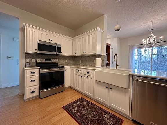 One level end unit over looks wooded area and a pond. One level living with only one small step from garage. Great views from every window. Fireplace warms the living room which has patio door to ground level private patio with retaining stone wall.