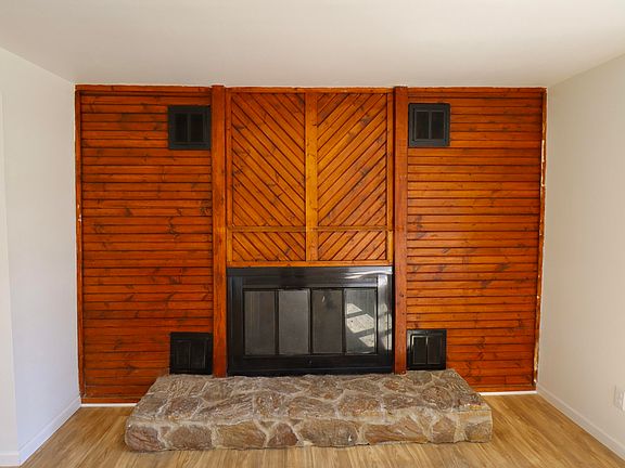 Sleek white cabinetryModern fixturesQuartz countertopsStylish backsplashNew front deckFresh sidingStone hearth