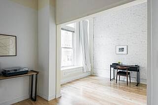 Housed in a historic building with architectural character, the loft features high ceilings, exposed brick, oversized windows, and hardwood floors. The open-concept living space includes a fully equipped kitchen, cozy living area, and a dedicated workspace. Stylish furnishings and thoughtful design touches make it feel like home from day one.