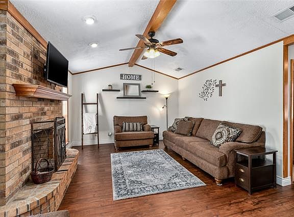 MULTIPLE OFFER, Deadline Saturday, March 6th at 5:00pm. Relax away from the hustle & bustle. Rich wood laminate floor in spacious living with vaulted ceiling with beam where windows frame brick wood-burn fireplace & hearth. Chair rail height paneling adds charm to kitchen & dining. Nearly floor-to-ceiling windows in versatile dining room with architectural arch pass-thru to living. Crisp white counter tops include a tiered peninsula with lower breakfast bar in kitchen embellished with some farmhouse elements. Back porch has been converted to a multi-purpose & memorable studio_sun_utility room with plank floors that extends to covered deck overlooking an expansive grass play area in backyard.