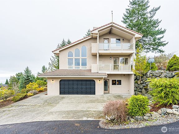 Perched atop Bell Hill in Sequim, this custom-built, Spanish Colonial–inspired home offers privacy, scale, and sweeping views of Sequim, Victoria, the Strait of Juan de Fuca, and Mountains. Arched windows, stucco exterior, and tile roof set a timeless tone, while the interior features sage cabinetry, quartz counters, extensive custom tilework, and dramatic natural light throughout. Spanning three levels with 5 bedrooms and 3 baths, the home is designed for both everyday living and entertaining. Enjoy multiple view decks, a covered patio, and a sun-filled solarium. Set on 1.22 acres, this is a rare hilltop retreat close to town.