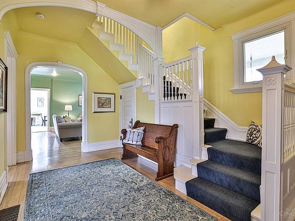 Queen Victorian 5,000+ sq ft of living space on .6 of an acre. Exterior painted 2023! Gourmet Kit walks out to screen porch, fin 3rd Fl w/great room, BR & Bath, carriage house w/office & den. 10ft ceiling, new windows, HW Fl, bow windows w/stain glass accents, mudroom, Rookwood fireplaces w/liner. Fin LL w/wine cellar. Primary suite w/newer deluxe bath & walk-in closet. 2nd fl laundry, cedar closet, workshop. 2+ garage has basement for storage. Generator for whole house.