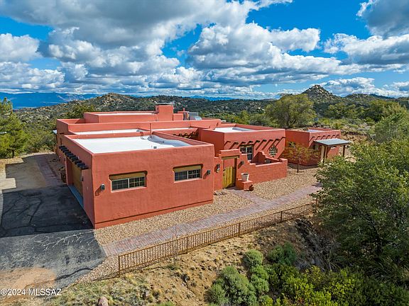 This stunning custom built hilltop Santa Fe home has breath taking mountain views and surrounds itself with mature oak trees, manzanita and boulders. Huge picture windows facing east and showcasing the Guilarro Mountains with gorgeous sunrises. Natures canvas! It also has a separate 2 car garage with separate electric meter and a 225 sqft studio/office and all of this on 3.50 acres. High ceilings with exposed beams, central vacuum, new AC, hot water circulating system & timer, fireplaces, jetted tub, surround sound throughout the home and so much more. And just feet away from the Coronado National trail. Must see in person. With these views nestled in historic small-town Oracle, this beauty will not last long.