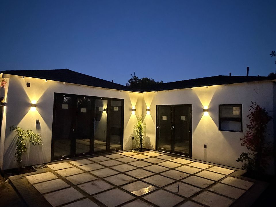 Modern flat drywallElectric fireplacePrivate patioFloating modern vanityNeutral modern led lightingLarge windowsLimestone tile floors