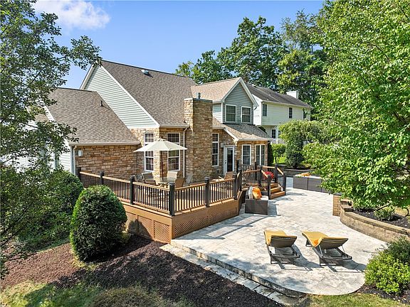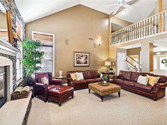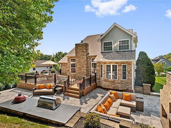 Stunning Custom Built inside and out! Beautiful Open Entry that greets you with an Impressive Stone Wall surrounding the Gas fireplace. 16ft Ceiling, Cherrywood built-ins in both Living and Dining areas. 1st Floor Master & Ensuite boasts 2 Lovely Palladian Windows. Generous Cabinets throughout the kitchen leads to a Bay Window Seating area overlooking your outdoor Oasis. 1st Floor Laundry. Walkout to your 600 sq. ft Timber Tech Deck with Post Lighting. Stone Covers the Back Wall and Chimney. Travertine Patio leads to the Fireplace and Outdoor Kitchen. Uplighting mingled throughout. Complete 2nd Living space in basement with Full Kitchen, Custom Cabinets, Built-ins and granite. Full bath, Custom Stone Walls, Zoned Surround Sound, Workout Room, Whole House Water Softener System. 2nd floor offers 3 large bedrooms, FB, Custom Window treatments, Natural Light Throughout. Abundant Storage located in Attic, large shed with electric, and Utility Room. New Roof 2023. Epoxy Garage Flooring 2024.