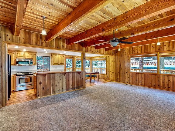 Centrally Located within Walking distance to the Lake, Village and the Resort. Open Floor Plan with wood beamed ceilings and river rock fireplace and custom mantel. Large Decks for entertaining and beautifully treed lot, spiral staircase to the deck below. Two rooms upstairs have Vaulted wood beam ceilings. The house has recently added new carpeting and freshly painted interior. Brand New Heating and Water Heater installed. Level Entry main floor with Custom Kitchen, dining and living. Two Main level bedrooms and a full bath. Large Game Room with Laundry and plenty of storage. Sliding Door to the exterior deck and land. The house also has an automatic natural gas Generator by Genarac as well as ample parking. The home has Lake Rights, come for a day and this charmer will want you staying for a lifetime. Back on Market, Buyers could not perform pending cancellation of escrow
