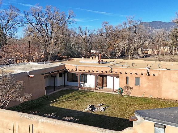A walk to Taos Plaza estate sited on approximately one, park-like acre of land rarely comes to market! 315 Theodora Street is an authentic 2,365 square feet mid-century adobe structure located on one of Taos’ premiere streets with views of Taos Mountain and the Sangre de Cristo foothills. This property offers such flexibility…move in now and complete cosmetic renovations over time; create a spectacular Northern New Mexican period renovation, or use it as a canvas to re-imagine a contemporary mid-century modern rebirth. Whatever choice, this property promises a smart investment with prospective equity gain in a sought after location. A traditional zaguan entry into a private courtyard through a winding portal is reminiscent of a hacienda main house. Inside double doors entry lies a stone floored foyer with a cozy fireplace study to the side, leading into a very spacious Living/Dining area with a stacked rock fireplace. Off the Living Area and Study is a kitchen with eat-in bar and a Butler’s Pantry/Utility Room with separate entry. From the kitchen are stairs to an additional 484 square feet basement, more than half of which is finished flex space and the remainder serves as a mechanical room with sump pump. Down a separate hallway off the foyer is another wing with three bedrooms including a guest bathroom, primary bedroom with kiva fireplace, and ensuite bathroom with tile floor, double vanity, separate shower, and jacuzzi tub. Bedrooms are spacious and all have walk-in closets. Bathrooms were renovated in the 1990’s. Plaster interior walls are recently painted. This solid 1950 construction features traditional Northern New Mexico architectural elements such as adobe buttress, vigas with tongue and groove ceilings, carved doors, beautifully finished doweled oak floors, and strip oak flooring throughout the bedroom wing. Endless large windows feature private views and warm ambient light in each room. Kitchen and Butler’s Pantry/Utility Room have new flooring, stainless steel dishwasher and refrigerator. Original O’Keefe and Merritt cooktop and double oven are well maintained and in good working order. New non-slip speckled resin floor on stairs and in basement. Extra fridge, washer and dryer in Butler’s Pantry/Utility Room convey with sale. Heating is natural gas baseboard. All Town utilities and Kit Carson Fiber Optic Internet onsite. GPS: 36.41312, -105.571817. This property was held in the same family for over 70 years. Property has remote controlled gated entrance and garage doors, ample graveled guest parking, and three car attached garage. The zaguan stucco walled front courtyard offers spacious al fresco entertaining with latilla covered outdoor kitchen featuring kiva fireplace, gas powered grill and salamander oven. Roof, comprised of brai and TPO, has been well maintained with no history of leaks during Seller’s tenure. Property is set off the road for privacy with old growth trees and fully irrigated grass lawn, fed by an irrigation well. Acequia surface water rights convey. Zoned R-14 in the Historic Overlay Zone. Seller has never used the fireplaces or outdoor kitchen. Images of Study, Living/Dining Area, and Primary Bedroom include virtual staging photos. Easy walk to historic Taos Plaza, Kit Carson Park, concerts, galleries, many restaurants and shops. Priced with a renovation in mind, this is a very special opportunity for the creative, discriminating Buyer.