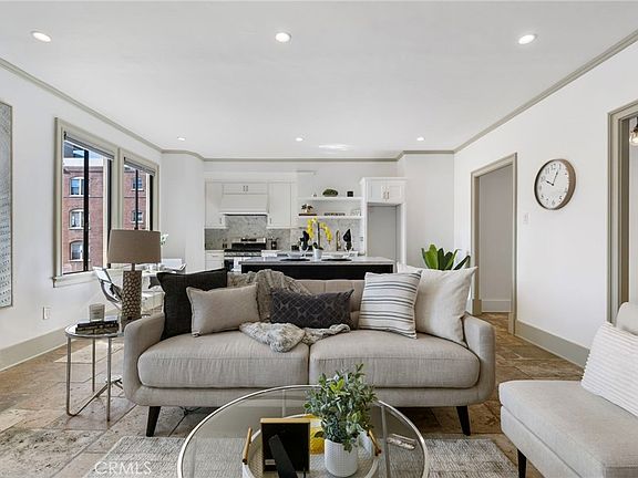 Discover a truly exceptional and unique residence in the iconic Willmore Building - a stunning, oversized unit created by merging two homes into one expansive and thoughtfully designed space. This remarkable property features an open floorplan wrapped in elegant stone floors, centered around a recently renovated kitchen with quartz countertops, a striking designer backsplash, an oversized eat-in island, and a charming brunch nook that flows effortlessly into the bright and airy living room. Large windows frame neighborhood views and fill the space with natural light. The two bedrooms sit on opposite wings for added privacy, with the primary suite tucked behind a hidden bookcase entry and offering its own full bathroom and large closet. The second bedroom, cozy yet beautifully appointed, includes custom built-ins, a window bench overlooking the city, and direct access to the in-unit laundry and a fully remodeled bathroom featuring a glass-enclosed shower, mosaic tile details, and abundant sunlight. The historic building features a lavish entry, a restaurant downstairs that offers owner discounts, a beautiful solarium, 360 rooftop terrace and dues cover all utilities (except cable/internet). All of this is just moments from Downtown Long Beach, The Pike, renowned dining, the beach bike path, the Queen Mary, and the best of coastal urban living.