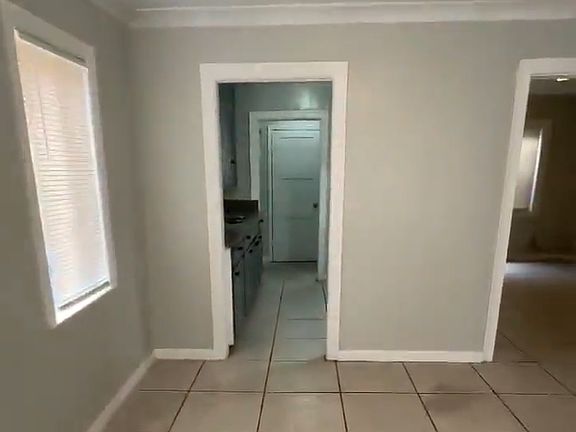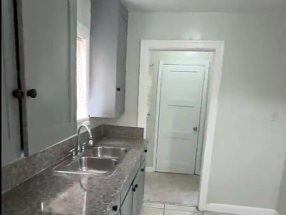 Inside, the living area is bright and open, featuring elegant ceramic tile floors throughout. The kitchen boasts modern gray cabinets and dark countertops, offering a clean and functional space for cooking.