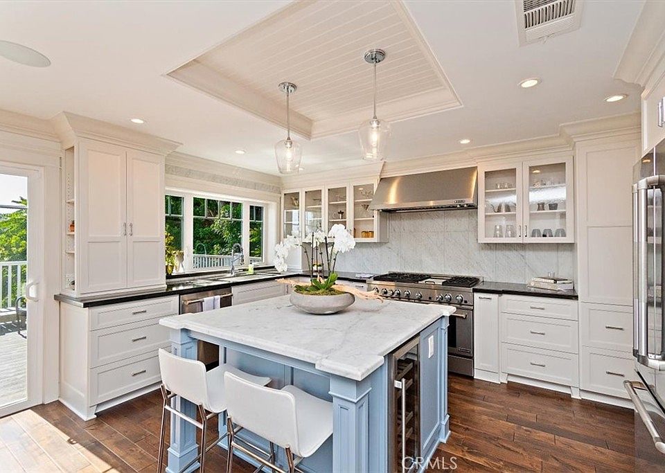 This is a rare gem, a bespoke creation that captures your attention from the moment you lay eyes on its curb appeal, and it doesn't stop impressing as you make your way through to the rear yard. Meticulous attention to detail is the hallmark of this home's design. They say the kitchen is the heartbeat of any home, and here, that sentiment is brought to life in exceptional fashion. A haven for culinary enthusiasts, this kitchen is a dream come true. Crafted with custom-designed solid wood cabinetry, it boasts top-of-the-line Jenn-Air stainless steel appliances, including a professional 48" range, a built-in refrigerator, and an antique limestone and marble combination that graces the counters. The unique tile backsplash adds an extra touch of charm, while the generously sized center island not only serves as a hub for culinary endeavors but also features a breakfast bar and a dedicated wine refrigerator. Completing the kitchen is a built-in dining banquette framed by cabinets on either side, seamlessly connecting to the sun-soaked living area. The original layout of three bedrooms has been thoughtfully reimagined, resulting in a magnificent master suite that exudes luxury. This home is an interior design enthusiast's dream, with features such as pop-up ceilings, refined crown molding, elegant wainscoting, and inviting wide-plank hardwood floors. Delight in the built-in bookshelves, custom window treatments, and exquisite light fixtures that elevate the living experience. The bathrooms are a testament to opulence, with intricate marble finishes that add a touch of glamour. The allure of this residence extends outdoors, where the terraced rear yard reveals four distinct levels. The pinnacle of outdoor living awaits at the highest tier, where a sprawling 650 sq ft composite deck is crowned with pristine white vinyl railing. This outdoor oasis is accessible from both the kitchen and the master suite, offering a seamless transition between indoor and outdoor living. Second tier has a bountiful vegetable garden including an area to practice your putting skills. The third tier has a built-in bocce court and the fourth tier has an orchard with avocado, lime and lemon trees. Space doesn't allow for a comprehensive list, but suffice it to say that this home is tailored for the discerning buyer who demands nothing but the finest. For a detailed compilation of additional features, please refer to the attached addendum.