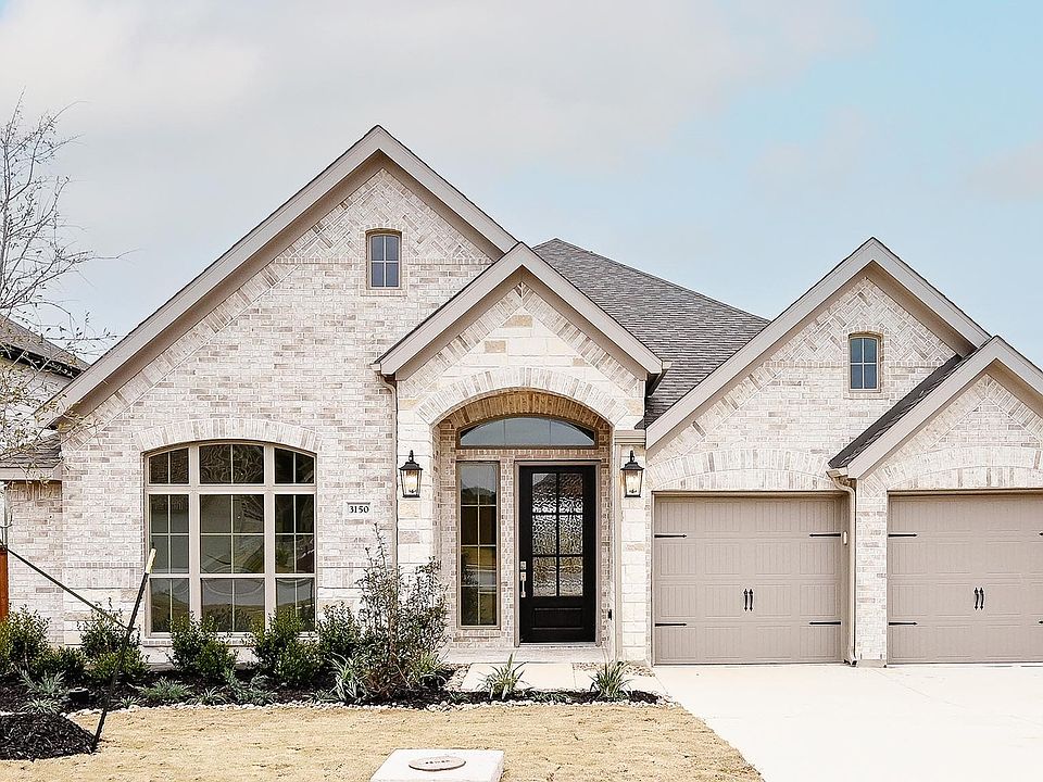 Home office with French doors set at entry with 12-foot ceiling. Game room with French doors off coffered extended entry. Spacious family room with wall of windows opens to kitchen and dining area. Kitchen hosts inviting island with built-in seating space. Primary suite includes bedroom with wall of windows. Dual vanities, corner garden tub, separate glass-enclosed shower and large walk-in closet in primary bath. Secondary bedrooms, a full bath plus a guest suite complete this open one-story design. Covered backyard patio. Two-car garage.