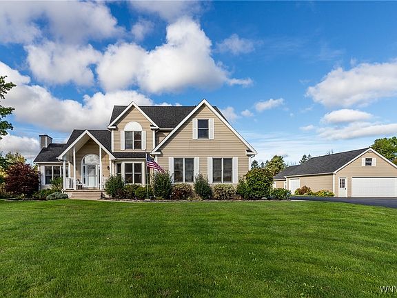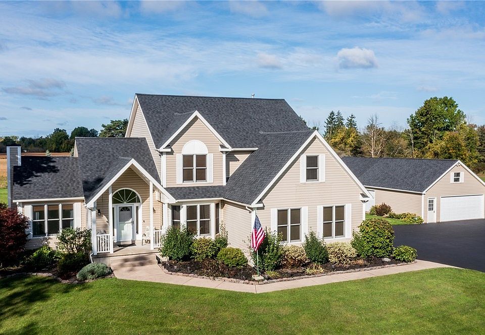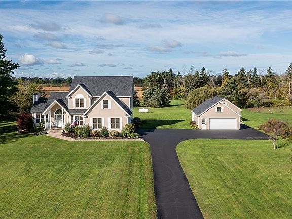 Your private oasis is here. Boasting over 2400 sq ft., this amazing property sets back off the road on 2.23 manicured acres with beautiful landscaping. Step inside the front door to the two-story foyer that leads you to the large formal dining and living rooms with beautiful hardwood floors that flow into the impressively spacious kitchen with tons of cabinetry and counter space, center island, built in work area and eating area. Enjoy the family room with gas fplc. Cathedral ceilings accent both the living and family rms. 1st flr laundry, Den/office/1st flr bedroom, and 1/2 bath round out the first floor. Upstairs you will enjoy your huge primary suite with full bath and walk-in closet and two other spacious bedrooms giving you a possible total of 4 bedrooms and 2.5 baths. Take a walk outside to relax on your huge rear covered deck. Want to play instead? Besides the attached 2+ car garage you will find two more outbuildings/garages for an additional 4+ parking for all your vehicles or toys to hold, with added space for a workshop and storage area above. Patio area between additional outbuildings.