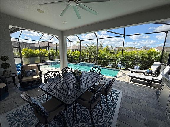 Look no further! Why wait for new construction? Curb appeal galore in this magnificent ICI Homes Serena pool home in Odessa's beautiful community of Asturia. The home features 2,225 sq. ft., 4 bedrooms, 3 bathrooms and an office/den. The open and light-filled living area beautifully combines a gourmet kitchen and great room with lovely views of the private pool/spa, pond and landscaping behind the highly upgraded home. Three-way split plan allows for privacy. A cook's kitchen with gas cooktop, stainless steel appliances, quartz countertops, tile backsplash and a large island with plenty of seating. Luxury vinyl plank floors run throughout much of the entire home with NO carpet. Laundry room with deep sink. Master bedroom features a master bathroom with double vanity, large stall shower, soaking tub, beautiful decorative tile and large walk-in closet. Custom pool with hot tub and full home width covered lanai allow for outdoor enjoyment while enjoying the beautiful pond area behind the property. Gorgeous built-in summer kitchen compliments the other upgrades with hot and cold running water. Home is pre-wired for landscape lighting, a generator (pad is already there) and for TV on the lanai. Laundry room and garage are both plumbed for sinks. Garage ceiling storage racks stay with home. Nicely landscaped. Asturia is an impressive community with charming architecture and is a short distance to all of Tampa Bay's many attractions; Gulf beaches, boating, local shopping, restaurants and Interstate-75, the Suncoast Parkway and Tampa International Airport. A great commute to points north and south. Make this beautiful home your own! MORE PHOTOS TO FOLLOW.