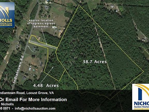 *** REAL ESTATE AUCTION *** List price is starting bid only. Price to be determined at live public auction. 4.48+/- Acre Parcel w/Perk Site and 38.71+/- Acre Parcel w/50 ft. Deeded Easement in Orange County VA Real Estate Auction Friday, March 24 at 11 am 31502 Indiantown Road Locust Grove, VA 22508 Price to be determined at Live Public Auction. * * * * * * * * * * * * * * * * * * * * * * * * * * * * * * * * * * * * * * * * * * 4.4+/- Building lot w/perk site and 50' easement to 38 +/- acre adjacent parcel -- Offered individually or in combination w/adjacent parcel. Only $15,000 starting bid. After purchasing property at Lake Anna, our seller no longer needs these parcels and has contracted us to market and sell them at public auction. This 4.4 acre parcel will be offered individually and also offered in combination with an adjacent 38 acre parcel. Bid and Buy at Auction. - 4.48 +/- acre parcel w/approved perk site - There is a 50' deeded easement to an adjacent 38.7 +/- acre adjacent parcel. We will offer each parcel individually and together. - Located only minutes from Rt. 20 - Tax Map: 011-00-00-00-0036L; Zoned: A - Only $15,000 Starting Bid for 4.48 acre parcel individually and $50,000 Starting Bid for both parcels together (4.48 and 38.7 acres) * * * * * * * * * * * * * * * * * * * * * * * * * * * * * * * * * * * * * * * * * * * * 38.71 +/- Acre Parcel w/ 50' Easement to Indiantown Rd--Offered Individually or in Combination w/adjacent 4.4 +/- acre parcel. Only $50,000 Starting Bid. After purchasing property at Lake Anna, our seller no longer needs these parcels and has contracted us to market and sell them at public auction. This 38.71-acre parcel will be offered individually and also offered in combination with an adjacent 4.48-acre parcel. Bid and Buy at Auction. - 38.71 +/- acre parcel - There is a 50' deeded easement to an adjacent 4.48 +/- acre adjacent parcel that gives ingress and egress onto Indiantown Rd. - We will offer each parcel individually and together. - Located only minutes from Rt. 20 - Tax Map: 011-00-00-00-0049-0; Zoned: A - Only $50,000 Starting Bid. * * * * * * * * * * * * * * * * * * * * * * * * * * * * * * * * * * * * * * * * * * * * Please preview the property at your leisure and contact Kelly Strauss for more information on the property (540-226-1279) or visit www.nichollsauction.com Nicholls Auction Marketing Group Corporate Office: 888.357.2814 E-mail: info@nichollsauction.com On the web at: www.nichollsauction.com VAAF 729