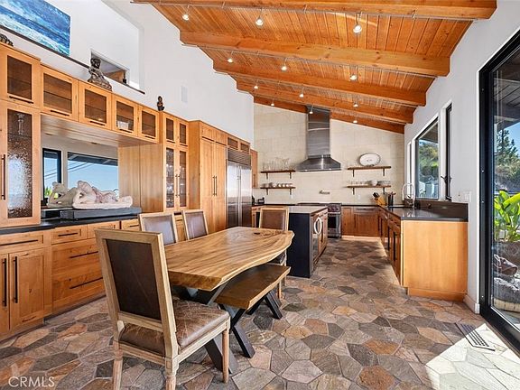 Perched above South Laguna Village, this spacious soft-contemporary home offers privacy and stunning coastal views. Nestled on a secluded cul-de-sac shared with only two other properties, the residence is thoughtfully designed to highlight sweeping vistas of the ocean and Catalina Island. Natural elements such as mahogany doors, cathedral wood-beam ceilings, honed black granite counters, and travertine stone lend warmth and character to the home. Set on a 7,500-square-foot lot, the property strikes a perfect balance between indoor and outdoor living, ideal for relaxation or entertaining. A generously sized ocean-view deck, located just off the kitchen, provides the perfect setting for al fresco dining and breathtaking sunset views. The home spans approximately 2,500 square feet, featuring 3 bedrooms and 3 bathrooms. The primary suite boasts ocean views, direct access to an outdoor patio, high ceilings, and a walk-in closet. The living room, dining area, and kitchen are highlighted by soaring ceilings and panoramic ocean vistas. Additional features include a garage with extra-high ceilings, a loft space of approximately 400 square feet, and a wine cellar. Located near Table Rock and West Street Beaches, this exceptional property offers convenient access to coastal attractions, making it the perfect retreat for those seeking a serene California beachside lifestyle.