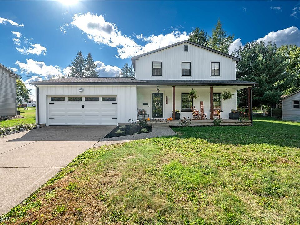 Curb appeal stands out with newer vinyl siding accented by Craftsman-style details, brand-new exterior and garage doors, a newer roof, and a cozy front porch for relaxing outdoors.