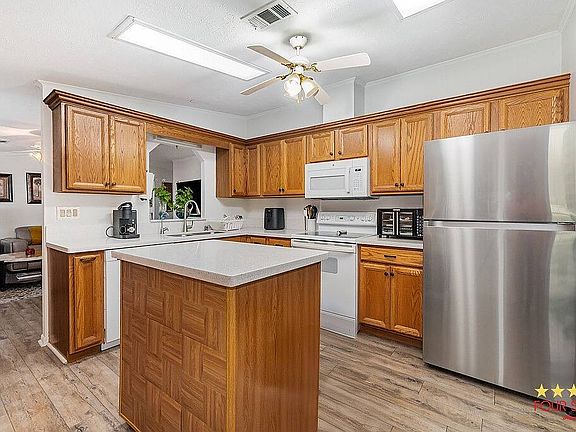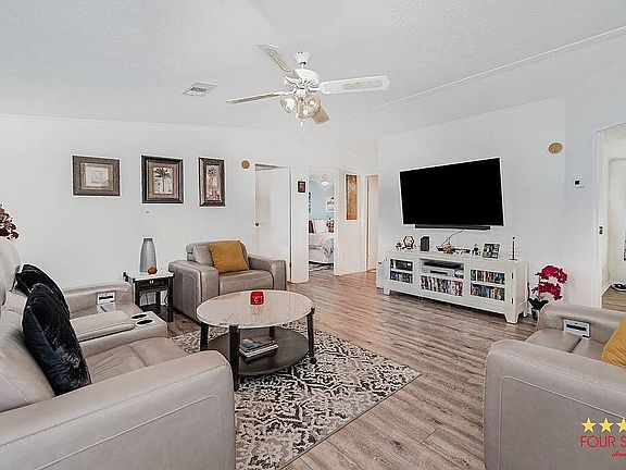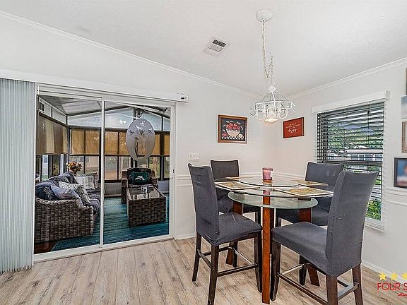 Amazing long covered carport as you approach this 3 bed, 2 bath furnished home. Step inside to a welcoming, open living area. The combination of a vaulted ceiling, luxury plank flooring and bright tones makes this home truly delightful. Enjoy an abundance of storage in the kitchen featuring a movable center island, gorgeous quartz countertops and a dedicated pantry wall. Perfectly situated is your amazing Florida room on the front of your home with blinds and a ceiling fan on the vaulted ceiling. Beautifully furnished 2 bedrooms have a private bath with bath, shower combo. A spacious primary with walk in closet and en suite bath, linen closet and shower. This home is equipped with a filtration system, designated crawl space access and shed. You will love working in your shed outfitted with AC and a workbench. Completing this home is a quaint paver patio overlooking your fruit tree. A perfect blend for a perfect price.