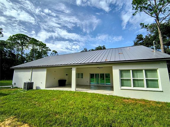 Welcome to your new EXCLUSIVE home!! No HOA and no CDD. Located on almost 1 acre of land on a dead road, with room to add other workshop or garage or a pool! This stunning home has a sleek metal roof and premium updates inside. When you enter the foyer you have a panoramic view of the great room, dining area, and the beautiful kitchen with a stone countertop island ready for entertaining. THE ELECTRIC RANGE IS A ALSO A CONVECTION OVEN AND AIR FRYER. The high ceilings give a very open feeling when you walk in. The xtra large ceiling fan in the great room keeps the air moving. The patio doors are ready for triple opening to allow access to the outdoor kitchen area or just to sit with your coffee and enjoy the expansive yard view! The back bedroom allows access for visiters to have access to the patio for their relaxation and coffee The backyard has enough trees to give areas of shade for reading and quiet time. The 1/2 bath in the garage keeps from tracking in dirt to the house. There is also a large sink hooked up in the garage to allow cleaning up after yard work.