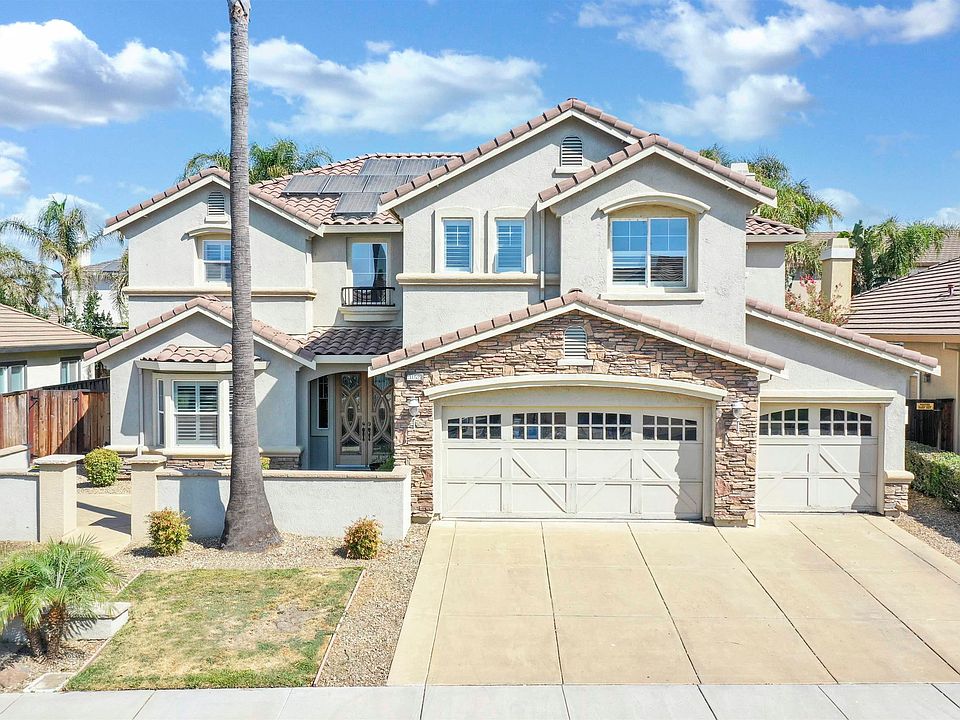 Current Loan is ASSUMABLE at 2.625%. If you're looking for a home that looks and feels like you're on vacation everyday, look no further. A true Entertainer's Paradise! This former Model has it all from custom molding and trim, built-in cabinetry, hardwood flooring, to an elegant spiral staircase. For the master chef, top of the line kitchen appliances including a Wolf stove with 8 burners, 4 ovens, a sub-zero built-in refrigerator, and a built-in wine refrigerator. This open floorplan offers so much versatility for entertaining, dining, or just relaxing. 2 sets of French doors lead you to the backyard oasis where you'll find a covered patio, the perfect space for watching a ball game with friends. And then there is the custom resort style swimming pool and spa complete with rock boulders and waterfalls. You'll be surrounded by palm trees and lush greenery and all the peaceful sounds of nature. Cozy up in the winter with 4 gorgeous, stone fireplaces. Once upstairs, you'll find a generous bonus room ideal for a second family room or game room. Two additional bedrooms and the exquisite, grand, primary suite awaits with a private balcony and separate office or leisure space. All this and OWNED Solar to curb your energy costs. Current VA Loan is ASSUMABLE.