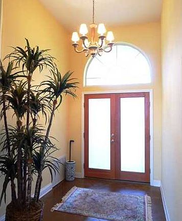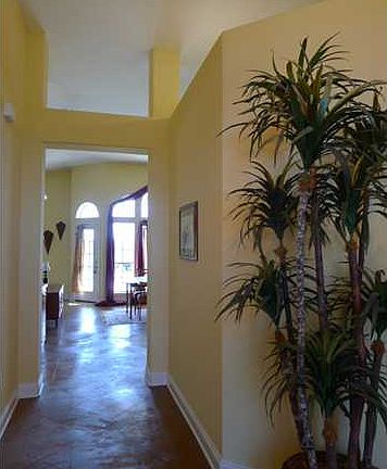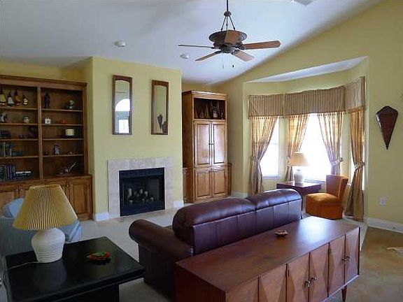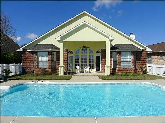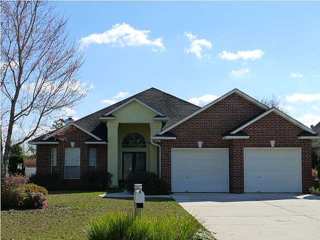 Lovely pool home in The Moors! Welcome to this patio home with High ceilings, stylish appointments, and its very own pool on a fenced lot. You are welcomed by the high portico with stucco accents and double wood doors with frosted glass entry with palladium window. The foyer, hallway and kitchen feature dramatic (easy care) stained concrete flooring. Notice the high ceilings throughout the living areas, high baseboards, rounded corners, and textured ceilings and walls. The living area/kitchen areas are open concept with 12' vaulted ceiling, plentiful custom cabinetry and upgraded fixtures. Kitchen features Kenmore stainless appliances, built in desk, step up breakfast bar and dining area with high triple windows with arched transoms. The living room is carpeted for warmth and comfort (replaced in past 2 years). A fireplace with travertine surround is flanked by built in cabinetry. A bay of windows and French door let in lots of light. The French door leads to the covered lanai and pool area. The bay window area in the master bedroom is a perfect spot for curling up with a book. There is a French door with easy access to the lanai and pool area. The master bath features a corner jetted garden tub with travertine surround, comfort height vanity with 2 sinks and tile countertop and a separate travertine shower with glass. The FIREPLACE sits across from the tub for ambiance and warmth. There is a linen closet as well as 2 walk in closets. One walk in closet is wired for an office! There are 2 additional bedrooms and a bath with travertine flooring and tile countertop. Home is wired for surround sound and has an alarm system. You will feel like you are on vacation with the soaring covered lanai, tidy fenced back yard, and fabulous pool, set up as a 'sports pool' with 2 shallow ends. A sprinkler system keeps the lawn watered. There is a greenbelt behind the fence for extra privacy. For added fun, you can walk a few doors down to the tennis courts, fitness center, clubhouse, and pool with hot tub; all part of this association. The Moors is very convenient to Interstate 10 with easy access to Pensacola and the beaches and all military bases from Navarre to Pensacola. Call for your personal tour today!