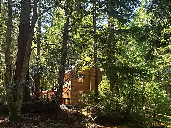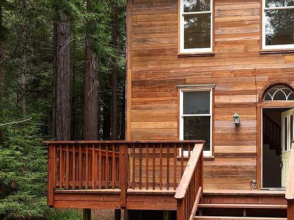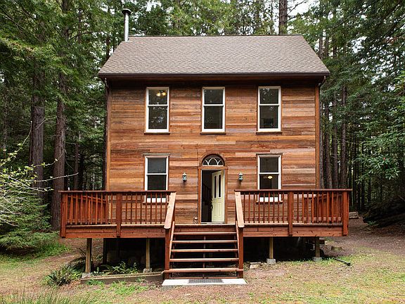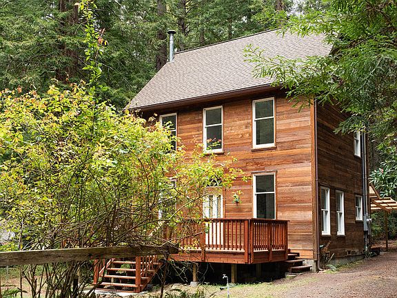 Nestled amongst majestic second-growth redwoods lies a New England-style Saltbox home that offers an idyllic escape. Old-growth redwood and new roof frame the structure, while inside, ample windows bathe the spacious 2 bed/1 bath home with abundant natural light. The simplicity of the interior presents a blank canvas awaiting the new owner's creative touch. Walk along the interlinking pathways of this woodland retreat to the enjoy the botanical whimsy at every turn -- Rhododendrons, trillium and ferns awaiting your discovery are scattered within the circle of trees. Just a stone's throw from the main residence and surrounded by this peaceful landscape sits a whimsical cottage where you can listen to the soothing sounds of the creek as the cares of the world fall away.