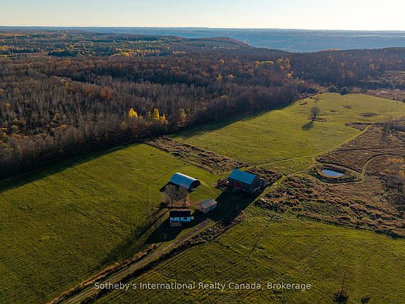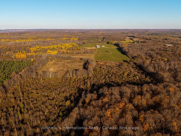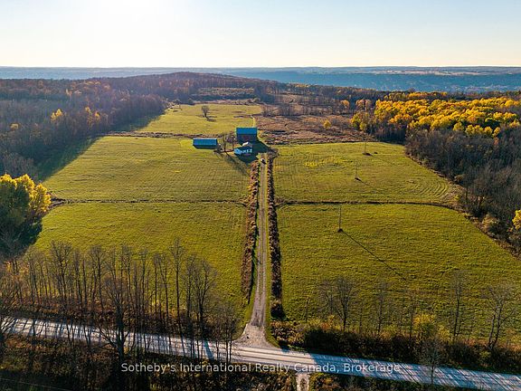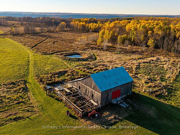 Escape to your own 99-acre country retreat in the heart of Grey Highlands, just minutes from Kimberley , Beaver Valley Ski Club, and Blue Mountain. Backing directly onto the Old Baldy Conservation Area and the Bruce Trail, this rare property offers unmatched access to nature and outdoor adventure. The landscape unfolds with rolling pastures, a tranquil pond, maple forests , and a newly built trail network perfect for hiking, cross-country skiing, snowshoeing, or ATVing. The cozy 2+1 bedroom, 2-bath cabin provides a comfortable home base while you envision building your dream country estate. A collection of outbuildings-including a Quonset hut with a new concrete pad, a classic bank barn, and a garage-offer endless versatility for farming, storage, or studio space. Whether you're dreaming of an equestrian property, a family retreat, or a sustainable working farm, the possibilities are endless. Enjoy sweeping valley views, magical sunsets, and the peaceful rhythm of rural life in this extraordinary natural setting. Harvest your gardens, tend to your goats, tap your maple syrup trees in your own backyard, hike down your property for a glass of wine at Old Baldy, watch the sunset and head to the famous Hearts restaurant for dinner.