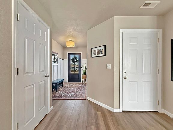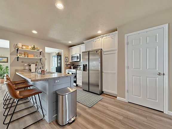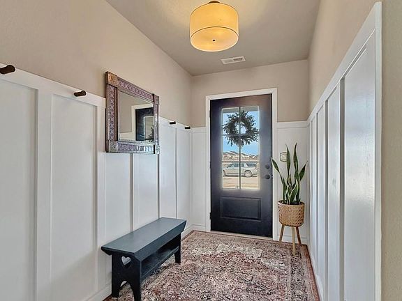 Don't miss your chance to own this stylish, next-to-new two-story home in the highly sought-after Stonebridge Farms neighborhood! From the moment you arrive, you'll be captivated by its timeless curb appeal, featuring crisp white siding, striking black accent stone, and a bold blue entry door for the perfect pop of color. Step inside to an inviting entryway, enhanced with board and batten wall detailing, which seamlessly leads into the beautifully designed kitchen. The kitchen boasts classic white shaker-style cabinets, stainless steel appliances, open shelving, and a charming shiplap-wrapped peninsula. Nearby, the powder bath has been stylishly upgraded with paneling and a splash of wallpaper for added character. The open-concept dining and living areas create a welcoming space—ideal for both everyday living and entertaining. Upstairs, you'll find three spacious bedrooms, including the oversized primary suite. Thoughtful upgrades include double mirror barn doors leading to the en-suite bath, dual sinks, and a large walk-in closet. Even the upper-level laundry area is designed for convenience, featuring extra cabinetry and a folding station. Step outside to enjoy the backyard oasis, complete with a concrete patio, a vinyl privacy fence, a dedicated rock area perfect for a firepit, and a lush, mature lawn with underground sprinklers. Located in Stonebridge Farms, a thoughtfully planned 160-acre community, residents enjoy park areas, walking and biking paths, a playground, a basketball court, and a picnic area. Schedule your showing today and make this incredible home yours!