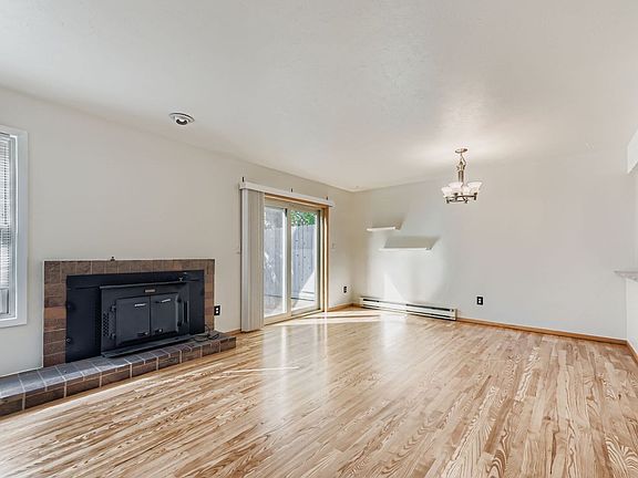 Inside, the home features hardwood floors throughout the main level, a cozy living room with a wood-burning fireplace, a spacious kitchen with plenty of storage, and a bright dining area that opens to the back patio with scenic views.