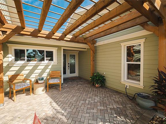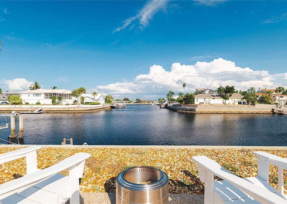Paradise awaits at this exceptional 3-bedroom, 2.5-bath waterfront estate with a detached 2-bedroom in-law suite on a double lot in New Port Richey. Resting proudly on 0.43 acres, this 4,018 SqFt home blends luxury, resilience, and comfort—having weathered two hurricanes with no damage or flooding. Fully restored in 2017, the main home features a chef’s kitchen with vaulted beamed ceilings, granite counters, stainless steel appliances, double ovens, and a spacious pantry. The expansive great room opens to tranquil waterfront views and an entertainer’s lanai. French doors lead to the primary suite, which includes a bonus room (currently used as a gym), a spa-like bath with soaking tub, dual sinks, and custom California Closets. Outdoors, enjoy the open-air saltwater pool, tiki hut with power and lighting, and a private dock with concrete pilings and a 16,000 lb boat lift. For the car enthusiast or RV owner, the 45’x38’ detached garage offers storage for 4–6 cars, RV access, and a second-floor in-law suite with 2 bedrooms, full kitchen, bathroom, and private balcony with water views. Additional features include a 2-car attached garage, solar water heater, 20 owned solar panels, plantation shutters, and lush landscaping. This is luxury waterfront living—designed for boaters, RVers, and anyone who craves space, style, and security.