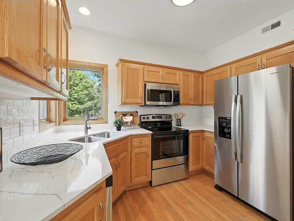 Bright and move-in ready, this updated home offers a functional layout and natural light throughout. The kitchen features stainless steel appliances, quartz-style counters, and a subway tile backsplash. Enjoy hardwood floors, a cozy gas fireplace, and a spacious deck overlooking a fenced yard. The finished lower level adds extra living space and a bathroom. Conveniently located near Deming Heights Park, bike trails, and just minutes to Northeast restaurants and shops. Easy to show, quick close possible.