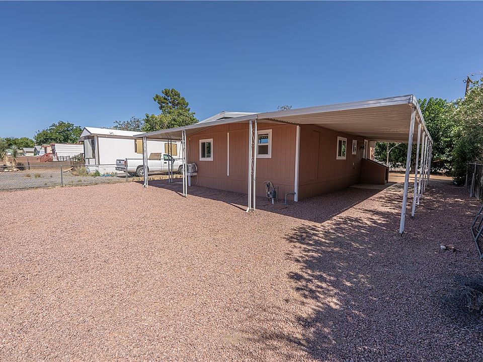 This beautifully remodeled 1981 doublewide blends classic structure with modern updates and is move-in ready! Located in Kingman, AZ, this home offers comfort, functionality, and style. Step inside to an open floor plan with brand-new flooring and fresh paint inside and two tone paint for the outside. Metal awing covering front and both sides for shade and parking. The spacious living area flows into a updated kitchen featuring stainless steel appliances, stainless steel range hood, refrigerator, glass mosaic backsplash, new cabinetry, updated fixtures, and a breakfast bar ideal for casual dining and entertaining. A separate laundry room sits just off the kitchen for added convenience. Split floor plan adding privacy to the primary suite. Other updates include new windows, toilets, and lighting throughout. Outside, the property is fully fenced with low-maintenance decorative gravel in the front yard, a carport, and alley access for easy parking. Whether you're relocating for the mild climate, small-town charm, or easy access to Las Vegas, Lake Havasu City, and the Grand Canyon, this home puts you in the heart of it all.