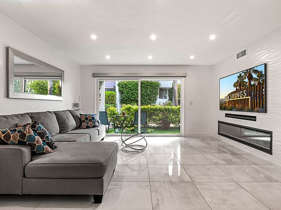 Spacious,immaculate, remodeled ground-level condo in a gated resort community. Tiled floors throughout, many kitchen upgrades include, granite counters, newer appliances, washer/dryer in unit. Views of green belt from front patio and Mountain View's from 2 rear patios. Plenty of storage. Community pool/spa and tennis courts. One assigned covered carport and plenty of guest parking. This condo is located in the level Beverly Hills area and minutes to downtown Palm Springs.