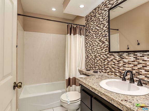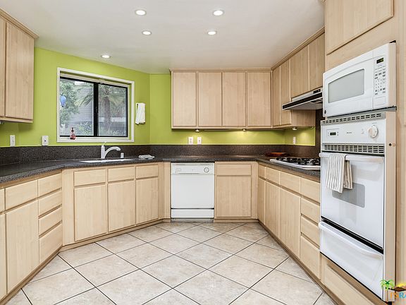 Seller says sell! Price reduced $20,000. Updated and move-in ready! Newer kitchen cabinets and counters, with gas cook top, oven, microwave, dishwasher and refrigerator. Tile flooring throughout living room, dining room, kitchen, hall, and bathrooms. Bathrooms have been updated. Guest bath has newer cabinet, counter, back splash and tub surround. Master bath has double sinks, tiled counters and large walk-in shower. Interior laundry with washer and dryer. Living room and both bedrooms have sliding doors to patios. Storage shed on back patio provides additional storage. Partially furnished per inventory. Pool/spa areas and tennis courts in gated community. Priced to sell now at $240,000. Fee simple land, no lease payments.