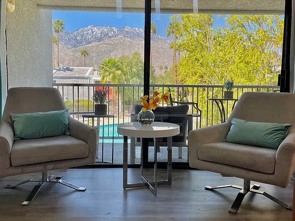 Enjoy the Palm Springs lifestyle in this beautifully and recently remodeled fully furnished home just a few minutes' drive to downtown Palm Springs. Open floorplan, vaulted ceilings, tennis & pickle ball courts, two pools and spas, and wonderful sunrise and sunset views overlooking the pool and the majestic mountains. Currently available for lease for the months of December, 2024, January, 2025, and from March 20, 2025 thru May, 2025. Available on a month-to-month basis (depending on availability). Currently available for the months of December 2024 and January, 2025. Also available from March 20, 2025 thru May, 2025. The rental of this condo includes all of the furniture, housewares and accessories. All utilities are paid by the homeowner.