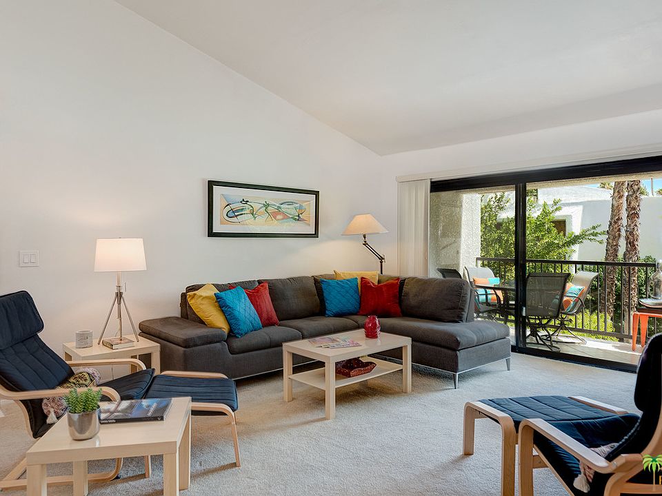 Stylish Pied-a-terre located in "The Palms" designed by renowned architect Hugh Kaptur. This second level Condo boasts soaring vaulted ceilings, 2 spacious balconies with pool and mountain views and recent renovations. The renovations include new dual pane windows and patio sliders ensuring quiet and energy saving benefits along with high end updates to the Kitchen and 2 Baths. Popcorn ceilings have been removed and new designer high end window treatments installed. The Palms association amenities include 2 pools, 2 spas, community BBQ, tennis courts, water and trash. Each unit has an assigned carport space and plenty of guest parking. The Condo comes furnished per inventory list. The Palms is on FEE land that you own and centrally located to all the greatness of Palm Springs!