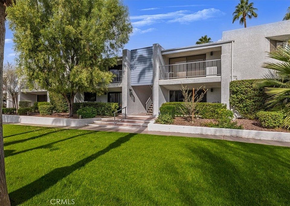 This unit is located in The Palms— a beautiful, well maintained gated community in the heart of the Beverly Hills neighborhood of Palm Springs, designed by famed architect Hugh Kaptura. Offering refined desert living and unbeatable access to nature, world-class dining, shopping, entertainment and conveniently located just a few minutes away from downtown Palm Springs. This upper residence offers approximately 1,230 sq. ft. of indoor living with 2 bedrooms and 2 updated bathrooms. Vaulted ceilings with clerestory windows, the unit offers a bright, open layout. Enjoy abundant natural light from skylights in both the entryway, master and guest bathroom. Take in stunning south-facing serene mountain and lush landscape views from your living room balcony. A second private balcony off the master bedroom offers a peaceful retreat with north-facing views. The kitchen features granite countertops and stainless steel appliances, and the unit includes a washer and dryer for added convenience.